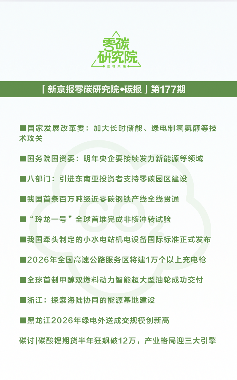 1. 双碳新闻 A. 政策指引 1. 国家发改委:加大长期储能、制氢、氨醇绿色发电技术研究。 12月25日,国家发展改革委基础设施发展司发布《加快现代基础设施体系建设》一文。合理利用交通设施空间发展光伏、储能、充电设施,优化增强航运水利枢纽的防洪、供水、发电功能。推动现有设施数字化改造升级,积极发展智慧交通。能源领域,支持新能源丰富地区就近开发消费,加强跨区域能源输送和区域内自主平衡,发展多能互补建设图案。鼓励国家算力中心和清洁能源基地协同建设。加快绿色电力园区、零碳园区、智能微电网等创新发展。推动新能源发电技术迭代更新和电网柔性直流输电、智能输电研发应用,加大长期储能、氨用、醇用绿色发电技术研究,持续推进核电聚变、柔性超超聚变改造等技术应用。零碳解读:文件还强调同步推进“超超临界+柔性改造”,这意味着现有煤电机组将具备调峰和长期储能作为“备用电源”的双重功能,将形成新能源+的互补收益模式能量储存。 2、国务院国资委:明年央企将继续发展新能源等领域。 12月22日至23日,国务院国资委召开中央业务领导会议,总结2025年工作和“十四五”成果,研究提出“十五五”工作思路,部署张、玉卓党组主任2026年主要任务。 2026年,中央企业将深入实施产业转型和未来产业启动行动,突出项目和场景牵引,持续发展新能源、新能源汽车、新材料、航空航天、低空经济、量子技术、6G等重点领域,加大选育力度企业化。深化拓展“AI+”行动,启动新一轮央企数字化转型行动,加强智能工厂梯度培育,持续推进技术创新和大规模设备更新,深化重点行业能源转型和碳减排,切实加快创新步伐。零碳解读:新能源(风、光、水、氢、储)、新能源汽车、新材料、航空航天、低空经济、量子技术、6G等被列为“七大新赛道”,要求央企“突出工程化、场景牵引”,加快从“项目示范”向“项目示范”转变。 3、八部门:引进东南亚投资者支持零碳园区建设。 12月24日,中国人民银行等八部门联合发布《关于金融稳定发展的意见》支持加快西部陆海新通道建设。”提出加强绿色金融内外合作。支持沿线省(区、市)共同研究绿色金融标准。完善中新绿色金融工作组机制,加强在绿色金融标准制定和应用、绿色金融产品、金融科技等方面的合作,支持绿色金融。引入东南亚、港澳地区投资者支持绿色金融建设。鼓励东南亚及港澳地区投资者投资沿线省(区、市)金融机构或企业发行的绿色债券。创新金融标准,支持走廊地区低碳经济发展。鼓励信用评级机构提供绿色债券评级服务,支持符合条件的租赁融资企业发行绿色债券。零碳解读:《意见》从完善金融组织合作体系、构建高质量融资体系、推动体制改革变革、建设数字金融服务平台、完善金融开放合作体系、深化跨省跨境金融监管协作和推进“两核金融监管协作”、推动“两核金融”西部陆海新通道高质量发展等方面提出了21条重点举措。二、行业动态 4、我国首条万吨近零碳钢生产线全面投产。 12月23日,我国首个百万吨近零碳碳钢生产线在湛江全面投产,标志着我国钢铁工业在绿色低碳发展领域取得了巨大成功。该生产线采用先进的氢冶金电冶炼工艺技术路径。核心氢基竖炉生产的直接还原钢金属化率达到预期目标;高效绿色电炉等设施进一步提高能源效率。与传统工艺相比,该生产线可减少50%至80%的碳排放。零碳诠释:生产线竖炉采用氢气作为主要还原剂替代焦炭,从源头上减少化石燃料碳排放;电炉、精炼、连铸环节均配备绿色电力,实现几乎零碳能源;全流程碳排放强度较传统工艺降低50%~80%该工艺每年可减少二氧化碳排放量约314万吨,相当于2000平方公里森林每年的吸收量。 5、世界第一堆“玲龙一号”完成非核转移试验。 12月23日,全球首个陆基商业模块化小堆——海南长江多用途模块化小堆技术示范工程“玲龙一号”顺利完成非核转移试验。转场过程中,各系统运行稳定,汽轮发电机组各项参数均满足设计要求,标志着“周长一号”小型堆示范工程汽轮发电机组非核蒸汽转场试验顺利完成。零碳解读:非核推力试验是核电机组建设的重要环节。被公认为核电组装前常规岛系统的一次综合性“实战演练”植物。全球首座反应堆“周1”完成非核转移试验,标志着该堆常规岛堆芯系统功能验证已达标,为后续核转移并网发电奠定了坚实的基础。 6、正式发布我国制定的小水电站机电设备国际标准。国际电工委员会(IEC)近日正式发布了IEC 61116:2025《小型水电站机电设备导则》,这是由我国专家制定的国际标准。该标准专门针对小水电机组,标志着我国在小水电技术领域进一步从“跟随者”向“引领者”转变。小水电是清洁可再生能源的重要组成部分,广泛应用于山区、农村和边远地区,具有重要意义。对推广普惠能源、改善民生具有重要意义。此次发布的国际标准主要针对单机容量15兆瓦及以下、转轮直径3米及以下的小型水轮发电机组。他们涵盖了从设备选型、制造、安装、运行维护到退役的全生命周期,形成了一套科学、系统、可用的技术体系。零碳解读:标准涵盖设备选型、制造、安装、运行维护直至退役的全过程。首次将模块化设计、装配式建筑和状态监测的要求写入国际文件,可以为发展中国家提供一整套可复制的技术框架,并大幅